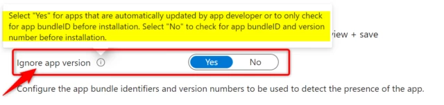 In Intune, when you build the package as a line-of-business app with the MSI, all you need to ensure is the package is set to ‘Ignore app version’. This prevents double deployment which may be what’s happening. Let our backend service handle the upgrade. Here’s the Intune package setting for the agent: