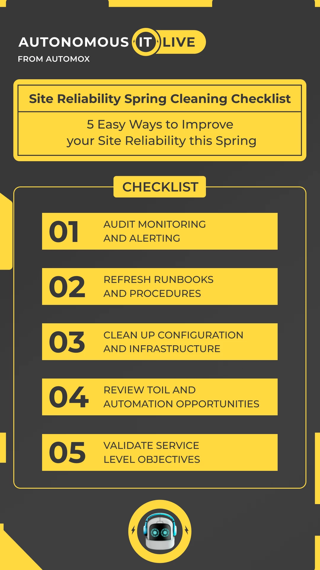 Explore strategies for boosting uptime and reducing incidents with automation. Experts Ted Harapat (Site Reliability Engineer), Spenser Pothier (Staff Site Reliability Engineer), and Jeremy Maldonado (Automate IT Podcast Host) bring their expertise to the table. We’ll also be discussing a spring cleaning checklist to refresh your site reliability!